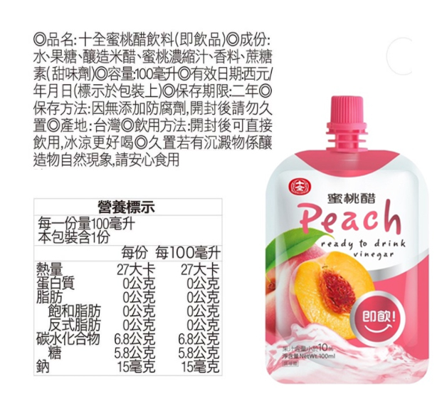 成分:水、果糖、釀造米醋、蜜桃濃縮汁、香料、蔗糖素(甜味劑)