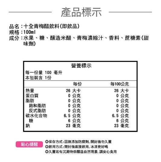 成分:水、果糖、釀造米醋、青梅濃縮汁、香料、蔗糖素(甜味劑)