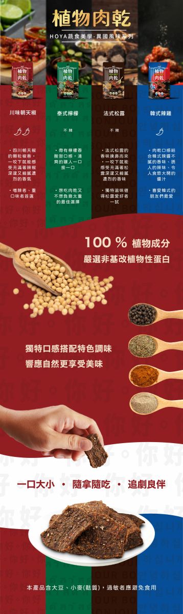成份:組織化植物蛋白(非基因改造大豆分離蛋白、非基因改造脫脂豆粉、小麥蛋白、玉米澱粉)、砂糖、醬油、D-山梨醇液70%(甜味劑)、麥芽糖、大豆沙拉油、豌豆粉、甘油(品質改良劑)、食鹽、黑胡椒粒、香料、辣椒粒、酵母抽出物、甘草粉、黑胡椒粉、辣椒粉、檸檬酸(調味劑)、白胡椒粉。